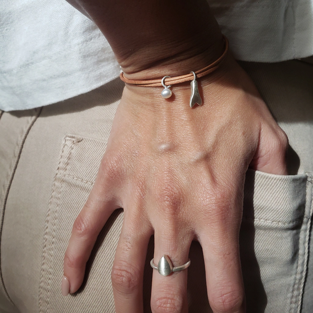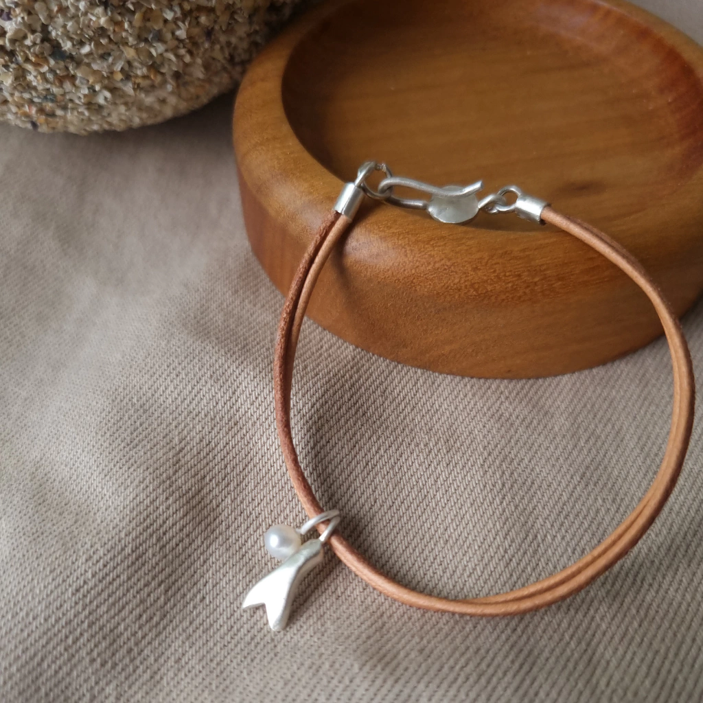 A Pulseira Caiçara é feita em couro natural, fecho em prata e dois pingentes delicados: Um rabo de peixe e uma pérola natural.